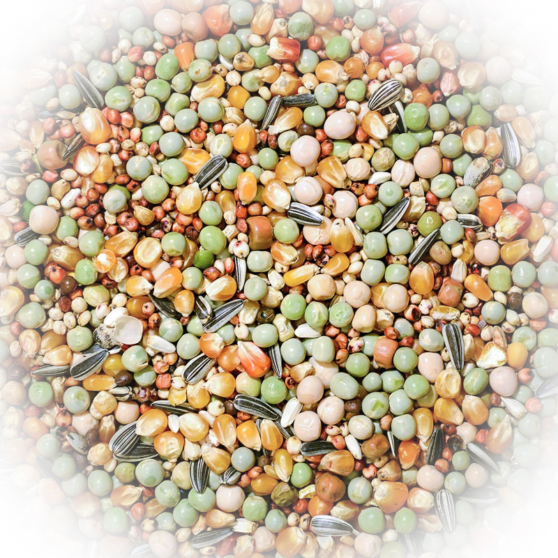 20% Erbsen grün, 15% Milo, 15% Popcornmais, 15% Dari, 10% Erbsen gelb, 5% Mais orange, 5% Dunpeas, 5% Wicken, 4% Kardisaat, 2% Sonnenblumenkerne, 1% Haferkerne, 1% Raps, 1% Leinsamen, 1% Hirse.